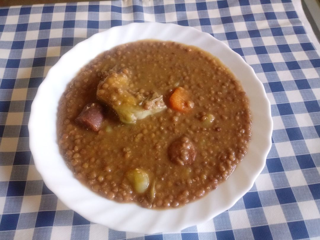 Poner las lentejas en agua fría ½ hora. Lavarlas en un escurridor y ponerlas en una olla junto con todas las verduras cortadas en trozos (menos las alcachofas y las patatas, que se ponen más tarde) y el chorizo. Los ajos se echan con piel para que no se deshagan.